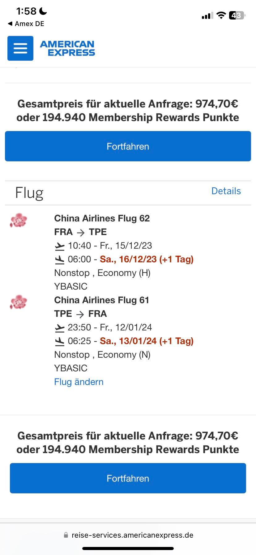 如果我透過Amex的訂票連結,相同時間的機票費用則為974.7歐元,如果你的旅遊基金還沒有使用的話,還可以在折抵兩百歐元,是不是很不錯呢。