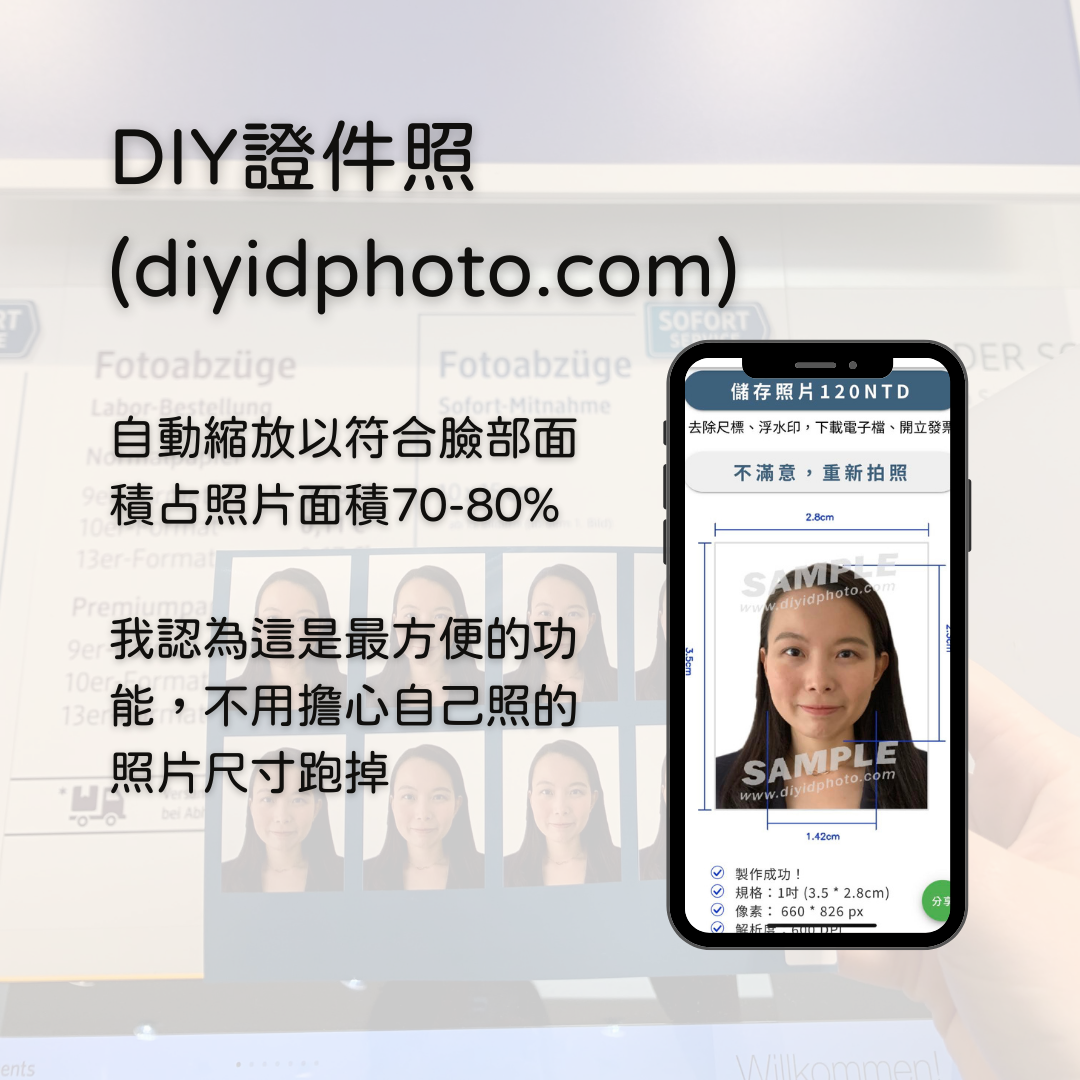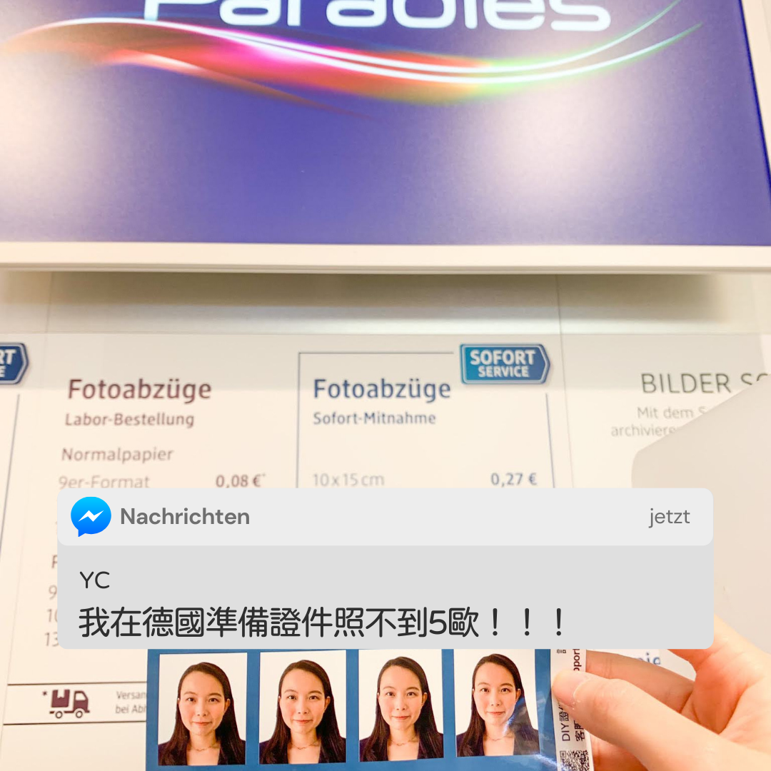 如果你在德國有證件照需求,可以參考看看呦;如果你在台灣,只要到配合的快照機,可以直接免費列印一次,懶得出門的人,負擔10台幣,也會直接郵寄到你家!